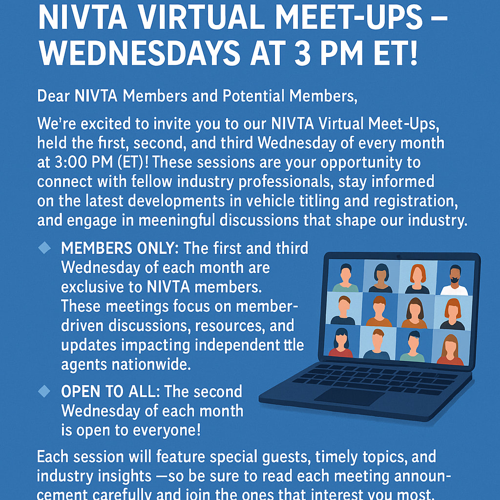 Join us for our NIVTA Member Virtual Meet-Up, held on the first Wednesday of every month at 3:00 PM (ET)! This members-only session keeps you connected and informed on the latest developments in vehicle titling and registration across the country.